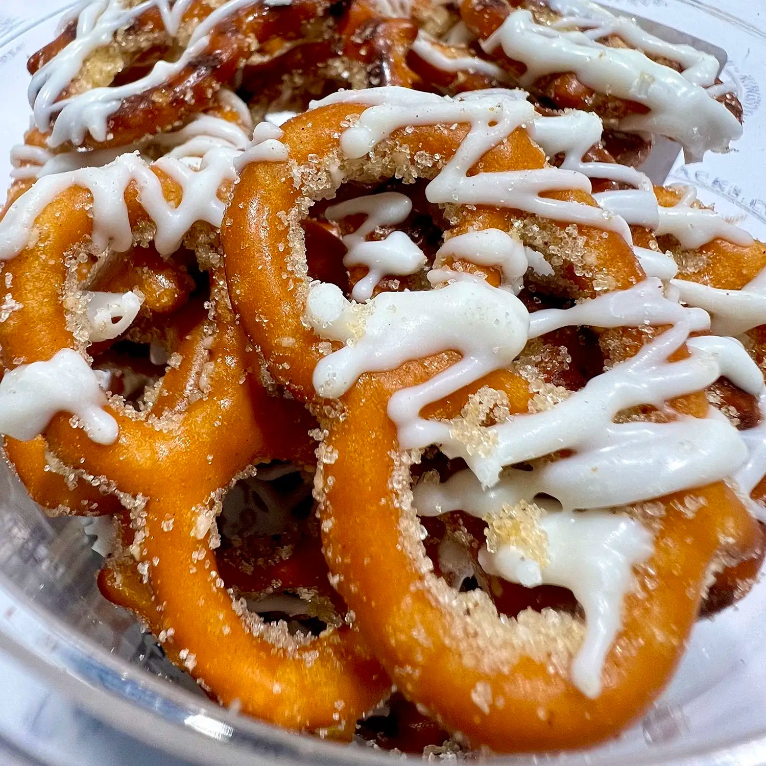 But we didn't stop there. To elevate the experience even further, we've adorned these delectable pretzels with a drizzle of velvety white chocolate. It's a symphony of flavors and textures that's sure to tantalize your taste buds and transport you to a place of pure indulgence.